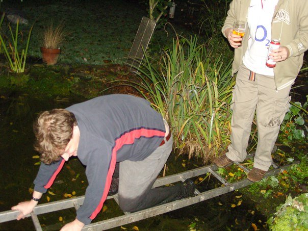 Some time later (it was dark) we made it over to Mr Warrens for fireworks. I walked straight into a pond i didn’t know was there. We then started playing games around the pond we did know was there. Bully ploughed straight into the pond – illustrated below, as others completed the game. He then declared he was going home to change. Usually this is the last we would see of him, but the mans commitment to science was such that he turned up 20 minutes later with dry trousers and shoes. He then proceeded to walk straight into the other pond.